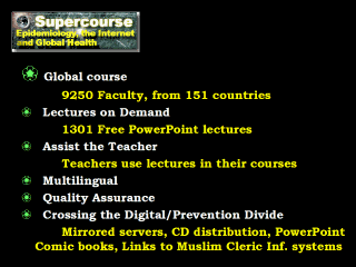 The Supercourse is the first global open source model for training in prevention. This means that the lectures are contributed voluntarily, and open to all with no copyright restrictions. The supercourse is now being developed and used by close to 10,000 people in 151 countries. Over 1300 lectures have been provided from leaders such as nobel prize winners, Ministers of Health, Directors of WHO institutes and top academics.