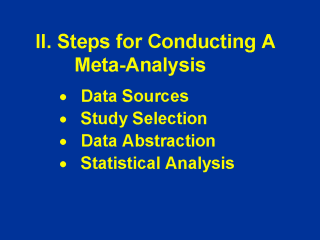 As can be seen, the four basic steps for conducting a meta-analysis include (1) the literature search, (2) the establishment of criteria for what studies will be included in the meta-analysis, (3) the recording of data from the included studies, and (4) the statistical analysis of the data. For this lecture, the focus will be on the meta-analysis of summary data. For more information on conducting a meta-analysis of individual patient data, see the following: Stewart LA, Clarke MJ. Practical methodology of meta-analyses (overviews) using updated individual patient data. Statistics in Medicine 14:2057-2079, 1995.