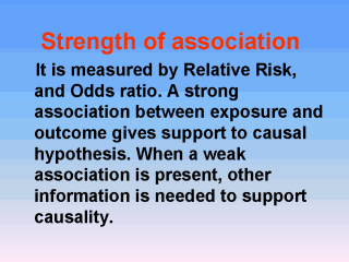 | Repeated findings of weak association in a well- designed study can still lead to effective public health action. Strength of association supports a hypothesis of causality, but weak association supported by other evidences of causality are also important. |