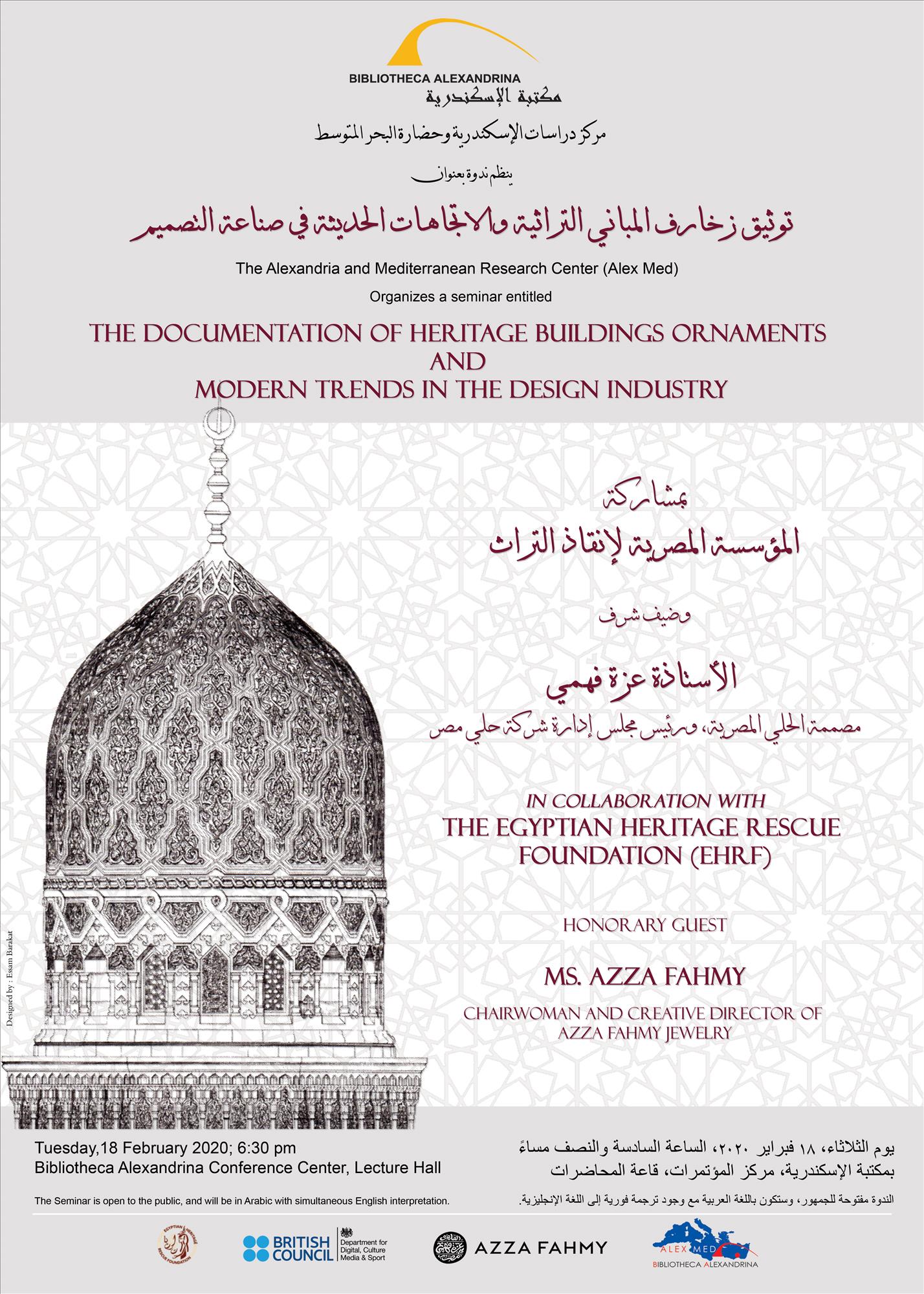 The Alexandria and Mediterranean Research Center (Alex Med) - Academic Research Sector at the Bibliotheca Alexandrina organized a seminar titled “The Documentation of Heritage Buildings Ornaments and Modern Trends in the Design Industry” in collaboration with The Egyptian Heritage Rescue Foundation (EHRF), Honorary Guest; Mrs. Azza Fahmy Egyptian Jewelry Designer and Founder of Azza Fahmy Jewelry.