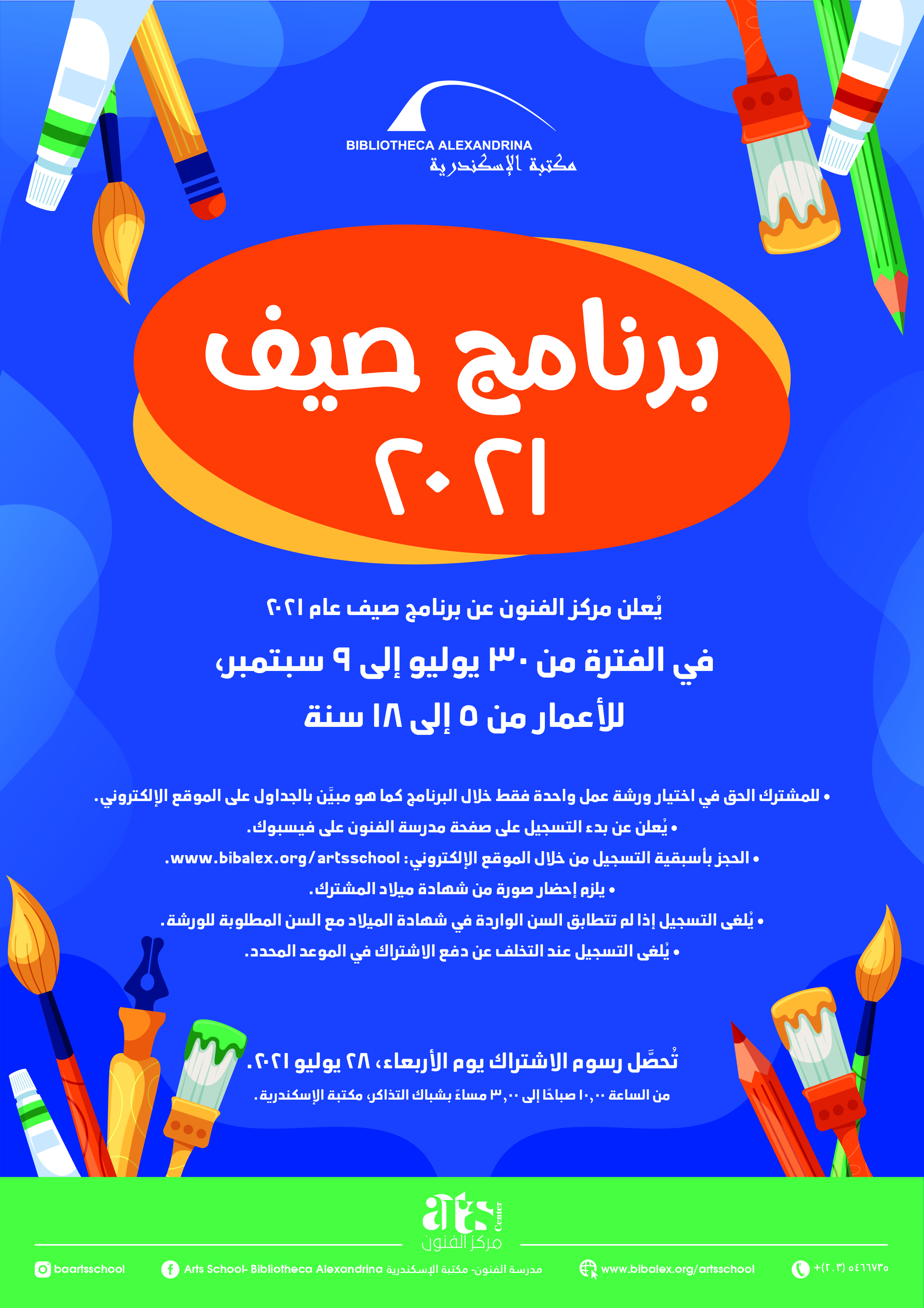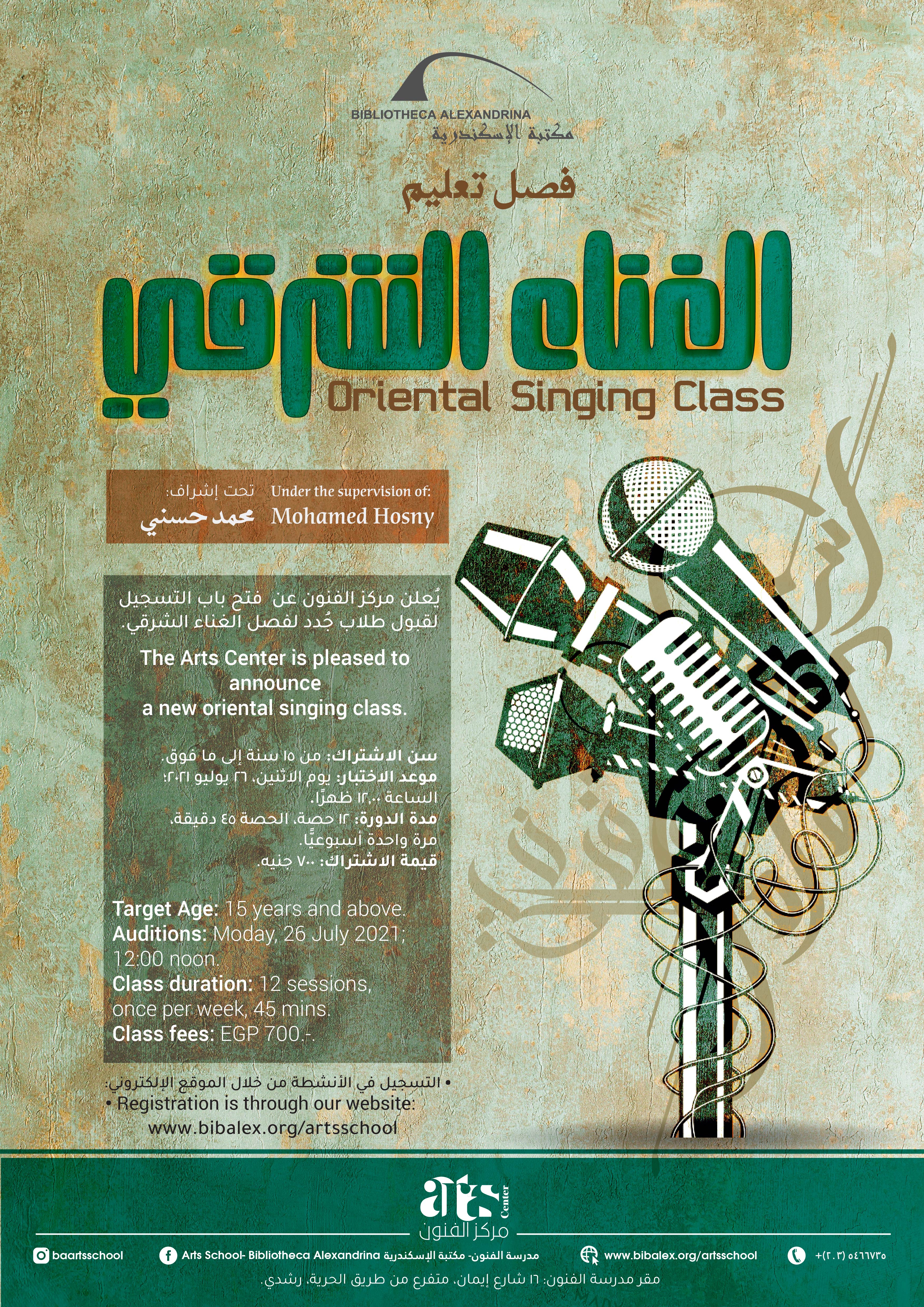 Oriental Singing Audition The Arts School- Bibliotheca Alexandrina announces the admission of new students in oriental singing classes, under the supervision of Dr. Mohamed Hosney Required Age: 15 and Above. Audition Date: Monday - 26 July - 2021 Time: 12:00 PM Please be there 15 minutes prior the audition time. Place: 16 Iman Street- Roushdy (In front of Deeb Mall) Fees: 700 EGP For Registration: www.bibalex.org/artsschool Oriental Singing Audition-2021