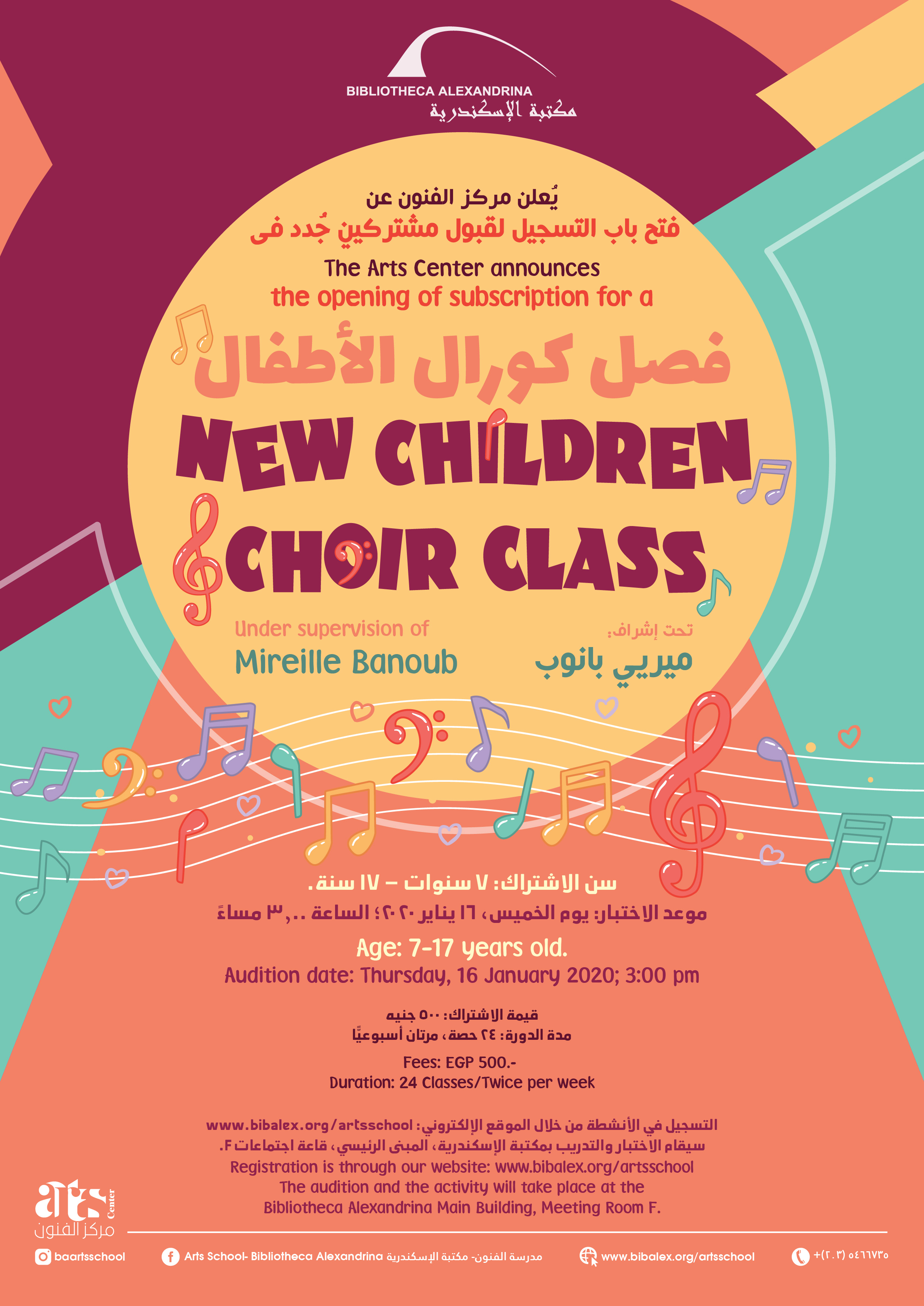The Arts School- Bibliotheca Alexandrina announces the admission of new students in Choir Class, under the supervision of Mrs. Mireille Banoub