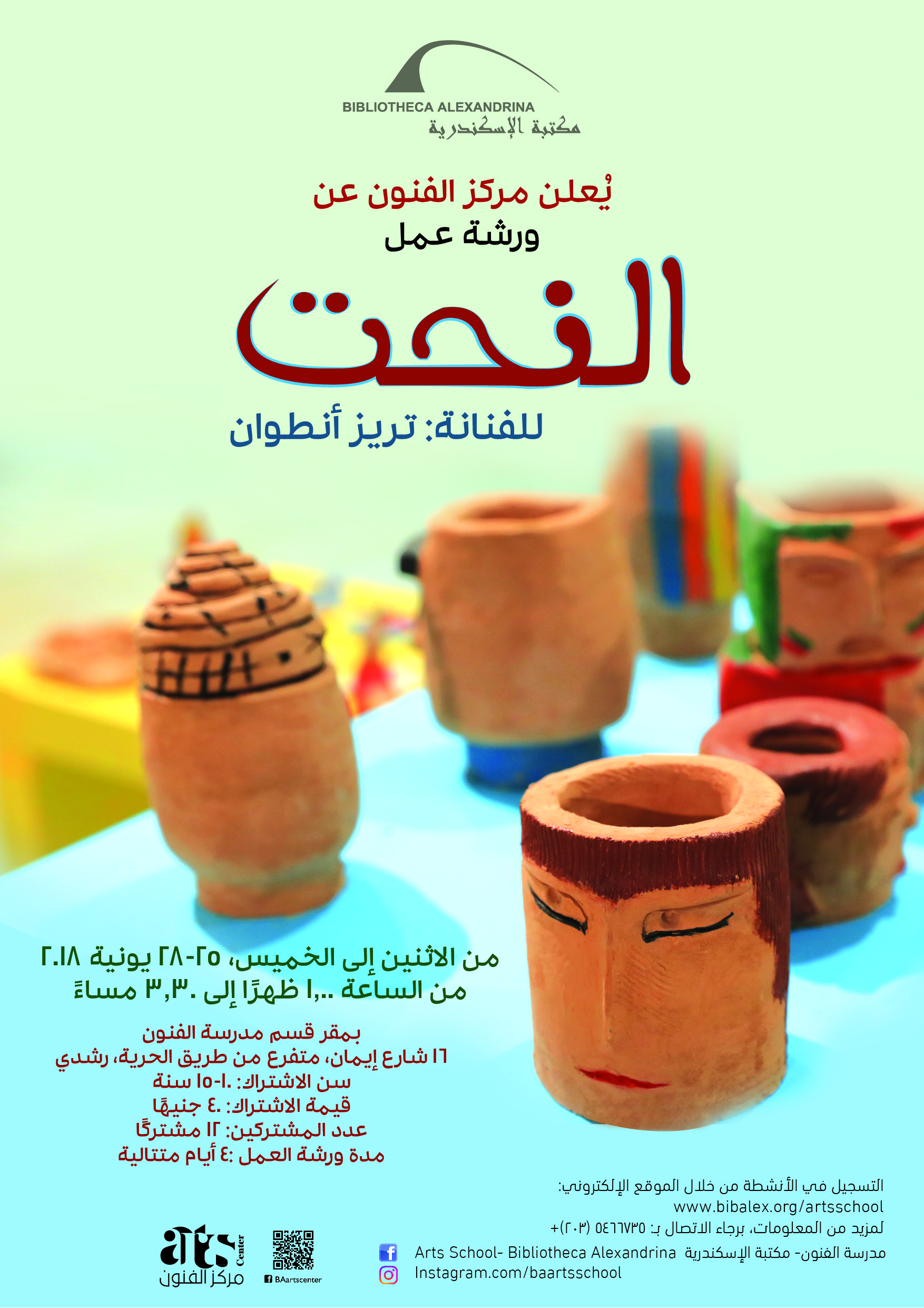 Workshop “Sculpture" by Therese Antoine The Workshop is 4 days, from 25 June to 28 June 2018. From 1:00 Pm to 3:30 pm. Required Age: From 10 to 15 years Fees: 40 EGP Maximum: 12 Member Place: 16 Iman Street- Roushdy (in front of Deeb Mall) For Registration: www.bibalex.org/artsschool