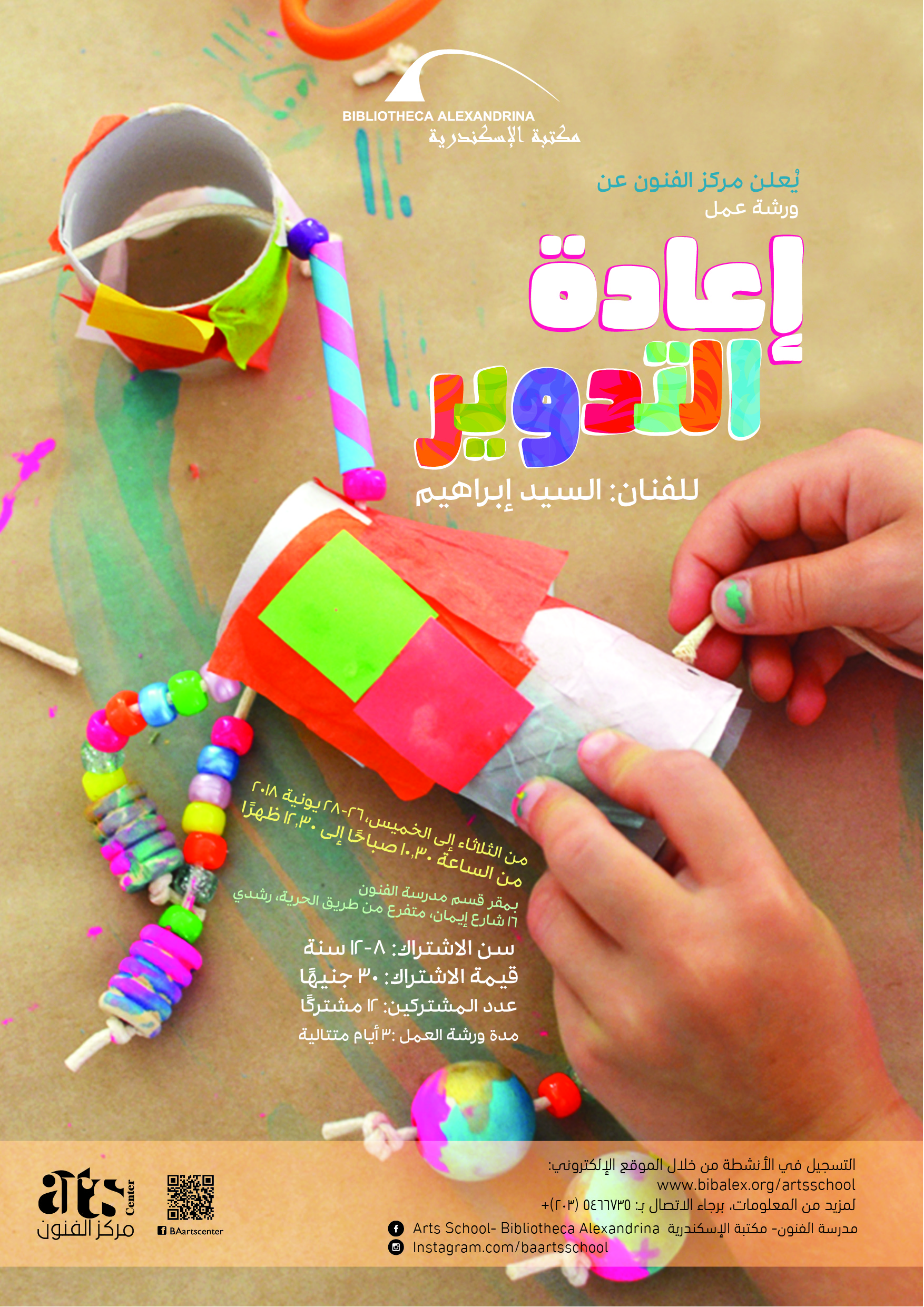 Workshop “Recycling" by El Sayed Ibrahim The Workshop is 3 days, from 26 June to 28 June 2018. From 10:30 Am to 12:30 pm. Required Age: From 8 to 12 years Fees: 30 EGP Maximum: 12 Member Place: 16 Iman Street- Roushdy (in front of Deeb Mall) For Registration: www.bibalex.org/artsschool