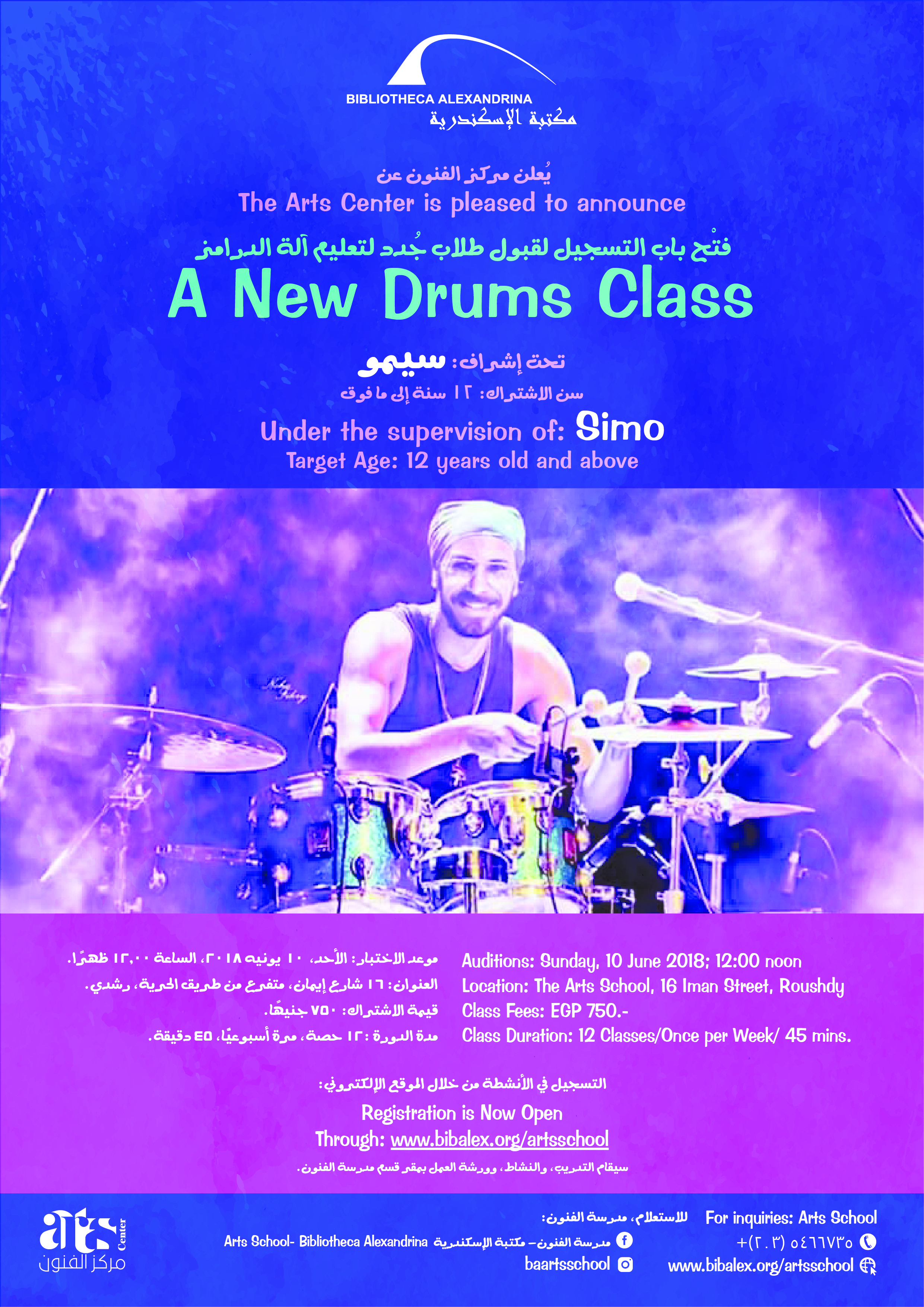 Drums Audition The Arts School- Bibliotheca Alexandrina announces the admission of new students in A New Drums Class, under the supervision of Simo. Required Age: From 12 years and above. Audition Date: Sunday, 10 June 2018. Time: 12:00 PM. Place: 16 Iman Street- Roushdy (in front of Deeb Mall). Fees: 750 EGP. For Registration: www.bibalex.org/artsschool.