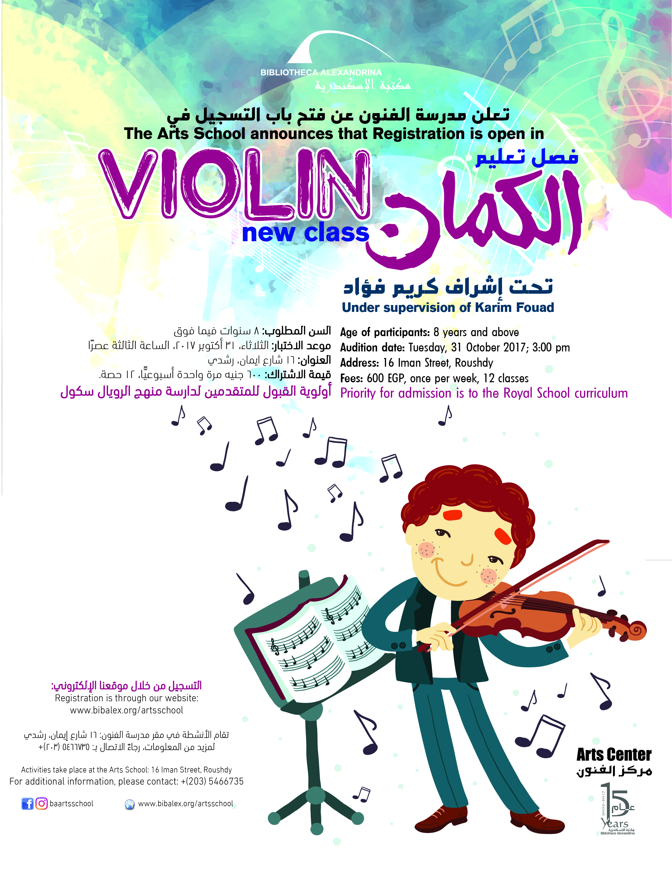 The Arts School- Bibliotheca Alexandrina announces the admission of new students in Violin new class, under the supervision of Karim Fouad Required Age: From 8 years and above. Audition Date: Tuesday 31 October 2017 Time: 3:00 PM Place: 16 Iman Street- Roushdy (In front of Deeb Mall) Fees: 600 EGP, once per week, 12 classes Priority For admission is to the Ryal School curriculum For Registration: www.bibalex.org/artsschool