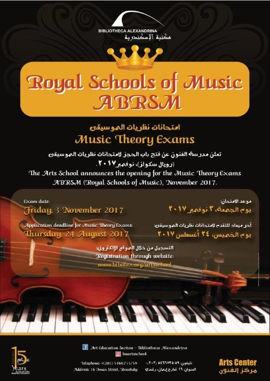 Arts School announces: - For the opening of the music theory exams (Royal School) November 2017. Which will be held on Friday, November 3, 2017. The deadline for submission will be Thursday, 24 August 2017.