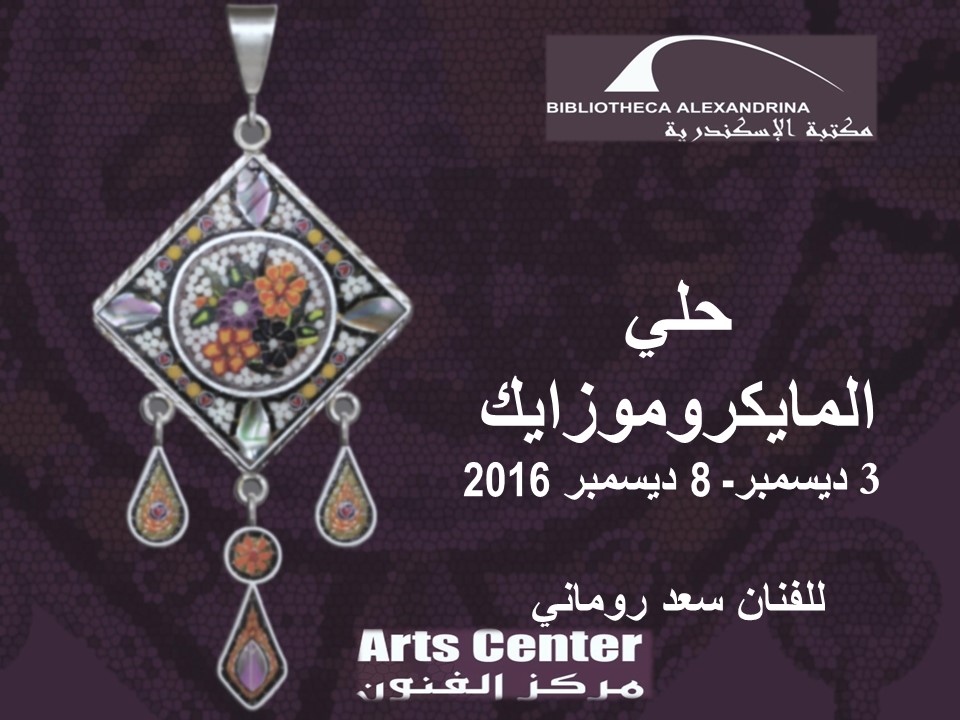 ورشة عمل "حُلي المايكروموزاييك" للفنان سعد روماني مدة الدورة ستة أيام متتالية، من 3 ديسمبر إلي 8 ديسمبر 2016ز من الساعة 10:00 صباحًا وحتى الساعة 5:00 مساءًا سن الاشتراك: من فوق 16 سنة عدد المشتركين: 12 مشترك قيمة الاشتراك: ألف جنيهًا لا يشترط خبرة سابقة في مجال الموزاييك يتم الحجز من خلال الموقع الإلكتروني قيمة الاشتراك لا تشمل الخامات الموقع الرسمي للفنان سعد روماني: www.saad-mosaic.com
