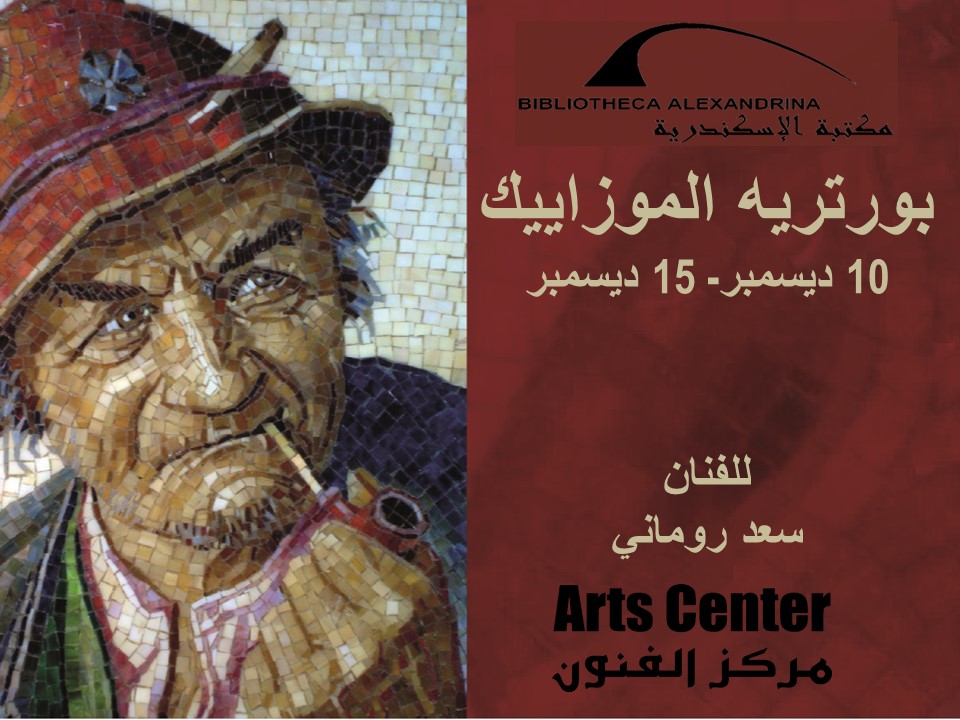 ورشة عمل "بورتريه الموزاييك" للفنان سعد روماني مدة الدورة ستة أيام متتالية، من 10 ديسمبر إلي 15 ديسمبر 2016. من الساعة 10:00 صباحًا وحتى الساعة 5:00 مساءًا سن الاشتراك: من فوق 16 سنة عدد المشتركين: 12 مشترك قيمة الاشتراك: ألف جنيهًا لا يشترط خبرة سابقة في مجال الموزاييك يتم الحجز من خلال الموقع الإلكتروني: قيمة الاشتراك لا تشمل الخامات لمزيد من المعلومات برجاء الاتصال: 5466735- 03 يرجى الاشتراك بصفحتنا على الفيسبوك: Art Education Section- Bibliotheca Alexandrina الموقع الرسمي للفنان سعد روماني: www.saad-mosaic.com