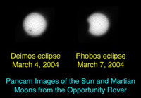 Fortunately, in the space era, solar eclipses by the two tiny moons of Mars have been imaged from the surface of the Red Planet by NASA's twin robotic, six-wheeled Mars Exploration Rovers. The picture below shows two Martian solar eclipses imaged by the Mars rover Opportunity.. |