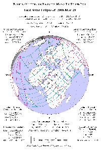 The total eclipse will be visible along the totality path, where the umbra of the lunar shadow falls on our planet. This path will be very long, extending for thousands of kilometres; but it will be also very narrow; less than 180 km wide! The eclipse will be partial in the much broader region swept by the lunar penumbra. In Alexandria, the eclipse will be partial and will start about a half hour before midday, lasting about two- and a half hours.