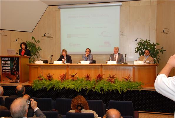 Dr. Wastawy, Jennefer Nicolson - Secretary General IFLA, Justice Albie Sachs, Dr. Paul Sturges - Chair IFLA/FAIFE Committee, Dr. Saad Azzahri - President AFLI