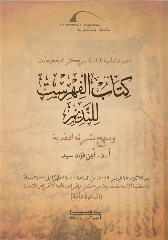 يقيم مركز المخطوطات التابع لقطاع التواصل الثقافي بمكتبة الإسكندرية الندوة العلمية الثامنة بعنوان "كتاب الفهرست للنديم ومنهج نشرته النقدية” ويلقيها الدكتور أيمن فؤاد السيد الباحث المتخصص في التاريخ والمخطوطات العربية الإسلامية ورئيس الجمعية المصرية التاريخية، وذلك في يوم الإثنين الموافق 18 فبراير من الساعة الثانية عشرة ظهرًا إلى الثالثة مساءً، وذلك في قاعة الأغراض المتعددة بمركز المؤتمرات بالمكتبة.