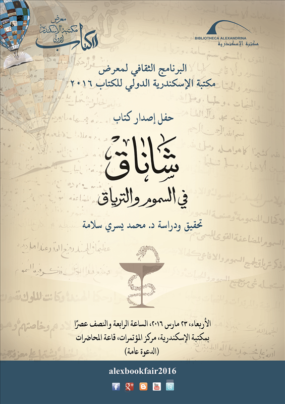 نظم مركز المخطوطات بمكتبة الإسكندرية احتفالية إصدار "كتاب شاناق في السموم والترياق" دراسة وتحقيق المرحوم الدكتور محمد يسري، الذي كان يعمل باحثًا ومحققًا للنصوص التراثية في مركز المخطوطات. وقد أشار الدكتور مدحت عيسى (القائم بأعمال مدير مركز المخطوطات) إلى أن هذا الكتاب هو باكورة التعاون مع معهد المخطوطات العربية بالقاهرة في مجال النشر المشترك؛ خاصةً أن ما يثيره هذا العمل من إشكاليات علمية، إضافة إلى قيمته في ذاته، يجعل نشره عملًا علميًّا جديرًا بالعناية. وقد أضاف المحقق إلى دراسته ملحقًا خاصًّا بأسماء النباتات الطبية والعقاقير المذكورة في النَّص، وإثبات أسمائها اللغوية في اللاتينية والإنجليزية.