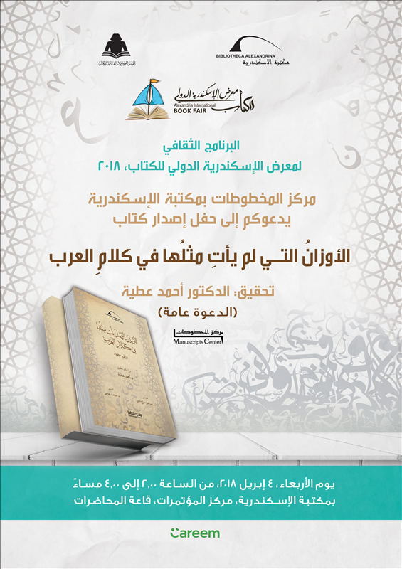 أقيمت إحتفالية إطلاق كتاب (الأوزان التي لم يأتي مثلها في كلام العرب) على هامش معرض كتاب مكتبة الإسكندرية الدولي وذلك في يوم 4 إبريل 2018.