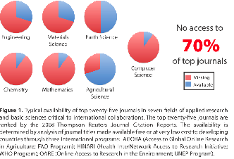The first challenge of establishing a national virtual science library is determining the appropriate content for the community of researchers. Most developing countries have access to more than 7,000 journal titles through three programs organized under the auspices of the United Nations in 2002 (OARE for environmental sciences, AGORA for agricultural sciences, and HINARI for health sciences). However, this journal set does not include the majority of the most frequently cited journals in several critical fields of research (Figure 1). On average, 70% of the top journals are not available through the three programs that most commonly serve the needs for knowledge access in more than one hundred countries. To address this fundamental problem, CRDF’s virtual science library program works with publishers to open access at the national level to almost all available research journals, including the top journals in each field. Following this open access period, the program then identifies through stakeholder meetings and usage statistics the supplementary coverage required to fully meet the needs of the national research community and liberate them from a de facto intellectual ghetto. In the case of the Iraq Virtual Science library, the program has supplemented the UN program journals with an additional 4,000 journal titles that provide the complete coverage needed by the more than 8,000 researchers actively using the system.