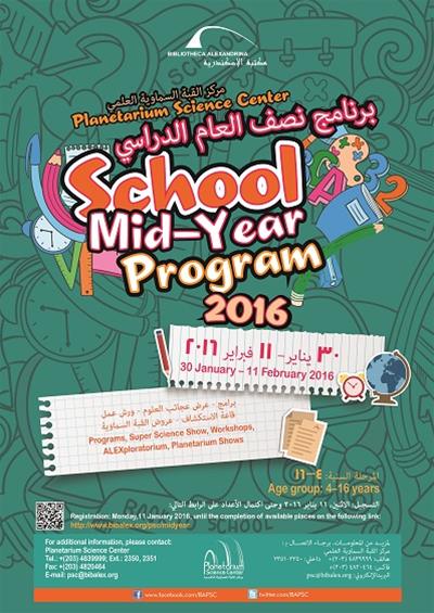 للتسجيل اضغط هنا ينظم مركز القبة السماوية العلمي برنامج نصف العام الدراسي للأطفال والشباب من سن 4 إلى 16 سنة، في الفترة من 30 يناير وحتى 11 فبراير 2016. سوف يتم الحجز من خلال موقعنا الإلكتروني: www.bibalex.org/psc/midyear ويبدأ التسجيل من يوم 11 يناير 2016 حتى اكتمال العدد. للاطلاع على جداول ورش عمل برنامج نصف العام الدراسي 2016، برجاء الضغط على الروابط التالية: برنامج نصف العام الدراسي 2016 برنامج الالكترونيات خلال برنامج نصف العام الدراسي 2016 برنامج نادي الشطرنج خلال نصف اعام الدراسي 2016 ورش عمل برنامج أسلوب الحياة المستدامة، ورش عمل برنامج السلسلة الغذائية، ورش عمل برنامج الليل والنهار (المرحلة العمرية: 4-6) ورش عمل برنامج أسلوب الحياة المستدامة، ورش عمل برنامج السلسلة الغذائية، ورش عمل برنامج الليل والنهار (المرحلة العمرية: 6-9) ورش عمل برنامج أسلوب الحياة المستدامة، ورش عمل برنامج السلسلة الغذائية، ورش عمل برنامج الليل والنهار (المرحلة العمرية: 9-12)