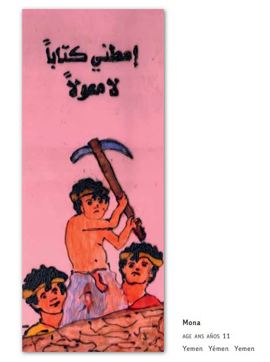 «أعطني كتابًا، لا معولًا» عنوان لوحة رسمتها طفلة تبلغ من العمر 11 عامًا؛ نُشرت ضمن مجموعة من الأعمال الفنية لأطفال من جميع أنحاء العالم في كتاب بعنوان «رؤية الأطفال لعمل الأطفال».