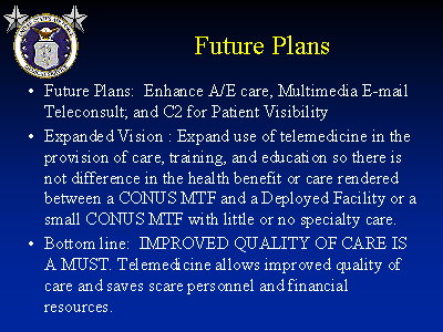 VISION : Expand use of telemedicine in the provision of care, training, and education so there is not difference in the health benefit or care rendered between a CONUS MTF and a Deployed Facility or a small CONUS MTF with little or no specialty care.