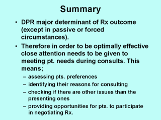 | In summary, The doctor patient-relationship can have significant impacts on Rx (treatment) outcomes, directly through discouraging the patient from returning or through doctor shopping, and indirectly, possibly by limiting the coping resources the patient perceives are available to cope with significant demands from chronic or life-threatening illness, and thereby impacting on the patient’s QoL. How can a doctor optimize the DPR? By ensuring the patients needs are met, where feasible. This involves careful assessment of the patient’s reasons for attending, their expectations and their current position regarding knowledge and attitudes about their condition. It is important to check with the patient if they would like to contribute towards decisions about treatment. In most minor conditions, patients will be happy to accept the doctors’ treatment recommendations, but with chronic illness, the situation develops where the patient becomes as much, if not more of an expert in his or her illness than the doctor. Under these circumstances, it is obligatory that the doctor and patient work as a partnership to tackle the patient’s problems. |