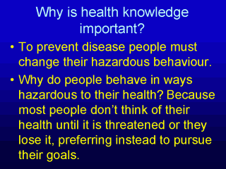 on its own, it is not sufficient to bring about behaviour change. Why do people behave in ways that are hazardous to their health? For a number of reasons. Approximately how many times have you actively and deliberately thought about your health in the past six months? Very few, unless you have had some prompt, such as an active illness episode as a prompt. Most people don’t think about their health until it goes wrong, is threatened or is brought to their attention. Research has shown that, even when smokers are shown the cancerous lungs of other smokers removed post mortem, the decision to stop smoking lasts only about 24-48 hours, after which the impact is not noticeable in terms of their behaviour. Many of the things that are hazardous to health happen to be enjoyable or desired by most people. How many of you would stop eating seafood if you learned that each day 5 tons of toxic heavy metals are poured into Hong Kong’s waters , which end up in the food chain and eventually the fish you eat? Would you? For how long? See what I mean? Most adults who smoke, in Hong Kong anyway, are aware of most of the hazards of smoking, but chose to continue smoking anyway. In other words, peoples’ goals are usually not the same as those of health professionals. |