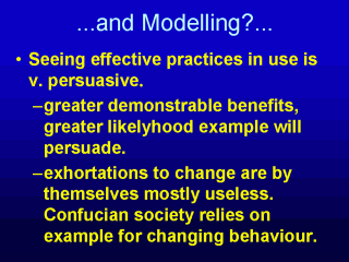 to the previous behaviour. The greater are the demonstrable benefits of behaviour change, the greater will be the likelihood that change will be tried. Simply asking or telling people to change will not be very helpful, and are usually pretty useless. In traditional Confucian society, behaviour is taught by example by older and more experienced members of the community and emulated by younger members. Various incentives and disincentives traditionally helped people to adhere to strict protocols of behaviour. |