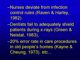 simple and least-effort route of care. Similarly, dentists unnecessarily expose patients to x-rays because they fail to correctly follow procedural guidelines closely enough. And so on. There are lots of different examples of this kind of problem. A further example is the high error rate in care procedures for older people in old people’s homes. You also cannot have failed to notice the recent spate of medical and nursing “errors” in Hong Kong’s hospitals, ranging from incorrect dialysis procedures through to medication errors. |