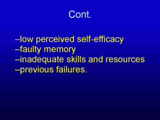 low perceived self-efficacy, attribution error, poor memory, inadequate skills and resources and previous failures all conspire to place considerable resistance in the path of people seeking change. While most health education programmes try to address the deficits in memory, skills and resources, few extend to addressing low perceived self-esttem and challenge both attribution errors and redressing previous failure. Finally, of course, there has to be sufficient motivation to change. |