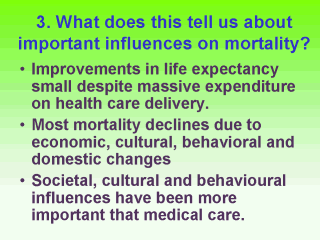 conclude from the data you have seen so far? 1. Despite the massive expenditure of health services delivery since WWII, the improvements in life expectancy have been meagre and far short of what might be expected from the trillions of US$ spent. 2. Most of the declines in mortality from the mid 19th to the mid 20th Centuries were due to societal, cultural, behavioural, educational and domestic changes, many of which were driven by legislation. 3. Changes in the way people live their lives prove to be far more effective in changing mortality rates than does better and more expensive medical technology. Sometimes these changes can be as simple as providing education for girls, changing food preparation or making condoms available for family planning. |