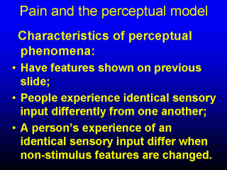 has these features? In order to decide this, we must consider a number of features that characterize pain: pain’s sensory features; pain’s sensory/motivational aspects; the role cognition plays in the experience of pain, and; the behavioural aspects of pain. |