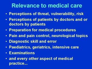 So why is perception of relevance to medical practice? Perception affects our behaviour and activity. We perceive we in control of what we do, but in reality you are much more controlled by your contigencies and perceptual patterning, language and the extent that you can manipulate the symbols and environment to achieve the outcomes you prefer than you might think. The extent to which people perceive themselves to be threatened or at risk influences their use of health care systems, consultation and health behaviour, as well as dictating their risk-taking behaviour (other people get sick and die, but I bet you don’t really realise that it will happen to you too one day, do you? No. See? Perceptual distortion. How you perceive your patients (compare how you perceive your patients now to how you will perceive them when you do your House Officer year) and how they perceive you will depend on a range of factors beyond your personal control, but which can be modified by careful attention to your habits of thought. The perceptions of patients are influenced by their expectations. What they perceive will depend on what things mean to them. What things mean will depend on their past experience and their knowledge. The importance of good communication is crucial. When carefully well prepared, people can be very strong, when unprepared, very afraid. Pain can be better controlled through an understanding of perception (see my MS lecture on pain) while a more accurate perception of the level of pain patients have to tolerate may help improve care for a wide range of surgical, burns, arthritis and cancer patients, to name just a few. Specific deficits in perceptual ability can be vital in diagnosis and assessing neurological impairments, and optimizing rehabilitation measures. Diagnosis is a process of pattern recognition - subtle shifts in the focus of attention can block new stimulus configurations and prevent the detection of a rare condition, and perhaps delay vital treatment. In paediatrics, geriatrics, and every branch of medicine in between perception is central to what occurs, but mostly you wont think about it, though it will affect profoundly what you do, why you do it, and of course its consequences.Oh yes, and it also affects the answers you give to exams too, because of how you perceive the questions…..
