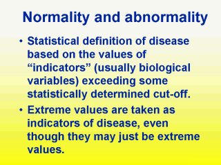 at the concepts that this view emphasizes. Essentially, this view implies that there is a “normal” state, and that deviations from this are therefore “abnormal”. The statistical models underpinning these ideas are