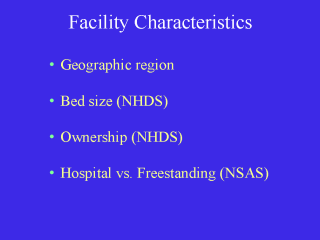 http://www.cdc.gov/nchs/products/catalogs/subject/nhds/nhds.htm Facility data in NSAS: http://www.cdc.gov/nchs/products/catalogs/subject/nsas/nsas.htm |