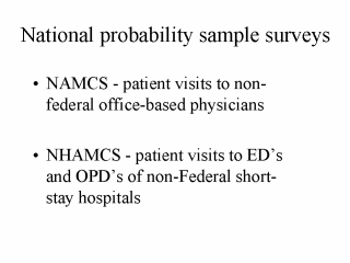 To learn more about NAMCS and NHAMCS, please click herehttp://www.cdc.gov/nchs/about/major/ahcd/ahcd1.htm