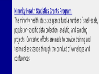 Minority Health Statistics Grants Programs http://www.cdc.gov/nchs/about/otheract/Educators/unieducators.htm#Minority Health Statistics Grants Programs |