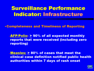 As I indicated earlier, the first type of surveillance performance indicator is one which evaluates the infrastructure of our surveillance system. A surveillance system with a well-functioning infrastructure is one in which there is good completeness and timeliness of reporting from all health care providers and organizations who encounter patients with the disease, exposure, or health behavior of interest. Surveillance reports from all reporting sites are routinely reported to the surveillance system on time. The specifics of how these requirements are met vary by disease. For example, for AFP surveillance, the surveillance infrastructure is working well if at least 90% of all clinics and other reporting sites send their reports to the central health department (where all surveillance data is gathered and summarized) at the end of each month so as it ensure its arrival within the first two weeks of the following month. For conditions such as AFP where there may not be any cases reported during a particular month, this includes sending a report to the central health department to notify them that no cases were found (i.e., zero reporting). In contrast, for a disease such as measles, where the number of cases occurring each month can still be high, a surveillance system with a well-functioning infrastructure is one in which at least 80% of cases that meet a predetermined case definition based on the occurrence of selected clinical symptoms are reported to the surveillance system within 7 days of rash onset.