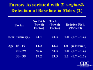 with having a new partner in the past 3 months, nor was it associated with age. Of anecdotal interest, is that one of the males with Trich reported having only male partners in the past 3 months, although he reported having had female partners in the more distant past. |
