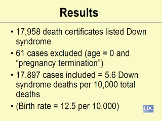 We identified 17,958 Down syndrome cases among over 32 million deaths. We excluded 61 cases that were also coded as pregnancy terminations. The remaining 17,897 cases represent 5.6 Down syndrome-associated deaths per 10,000 total deaths for the study period. In comparison, the birth rate for Down syndrome is about 12.5 per 10,000. |