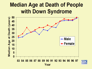 The median age at death of people with Down syndrome increased substantially from 25 years in 1983 to 49 years in 1997, an average increase of 1.7 years per year studied. In contrast, the median age at death in the general population increased from 73 to 76 years during the period of study, about 0.2 years per year studied. |