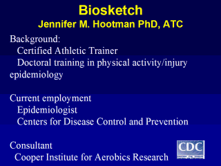 I started my career as a sports medicine clinician taking care of collegiate athletes and teaching undergraduates in Athletic Training. Injury surveillance and identifying injury risk factors was my area of interest. Since there is little epidemiological information about sports injuries available, I obtained my doctoral degree in Epidemiology. This lecture is a culmination of my doctoral dissertation focusing on the epidemiology of activity-related injuries among moderately active adults. I currently work at the Centers for Disease Control in the Arthritis Program, where I consult with various organizations and review grants and manuscripts on the topic of sports injury epidemiology. My focus within the Arthritis Program is to conduct public health surveillance on arthritis and to investigate the relationship between physical activity, joint injury and arthritis.