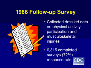 The 1986 survey was mailed to only those participants who returned a similar mailed survey in 1982. The 1986 survey asked detailed questions on participation in various activities over the preceding 10 years. It also contained questions on musculoskeletal injuries over the same time period and gathered information on the site, severity and cause of injury. Additional risk factor information such as training practices and injury history were also ascertained. There were a total of 6,315 surveys returned in 1986.
