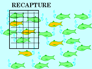 翌日また魚を網で捕まえ、このように標識と再捕護を行う。捕まえた魚の中に 何匹しるしを付けた魚がいるかということから湖の中の魚を極めて正確に 推定することができる。
