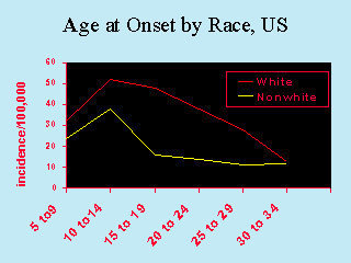La población "no blanca" tiende a tener menor incidencia de la enfermedad en los Estados Unidos. Pese a ello, esta diferencia no es de base genética ya que cuando se ajusta por nivel socioenómico, las diferencias desaparecen.