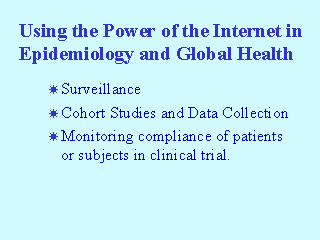 The following slides present examples of current uses of the world wide web that hold promise of dramatically changing the way we conduct research. One in the area of surveillance, conducting a cohort study, and monitoring subjects in a clinical trial. |