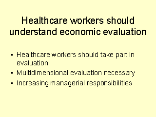 - all health care systems are run by professionals who cannot be excluded from evaluation of any aspect of process and outcome within these systems; - economic evaluation is heavily dependent on the estimates of the effectiveness of the various health care interventions. The involvement of health care workers should ensure that all dimensions of evaluation are taken into account in a multidimensional approach which includes equity and humanity as well as effectiveness and economic efficiency. This function is especially important when a health care worker, usually a GP, is called to be the patient's "agent" in an uncertain and complicated health "market". As the GP's experience and training allows him or her to advise the patient, so an equivalent basic understanding of economic principles will allow better judgment both of services on offer and of allocation of the GP's own resources; - workers in many health care systems are called to hold managerial functions of ever increasing complexity which require a basic understanding of the principles underlying economic evaluation; |