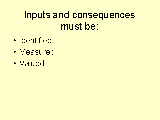 - identify inputs and consequences; - measure inputs and consequences using appropriate physical units; - valuate inputs and consequences; Problems are encountered in all three phases. Some items are difficult to identify as some health care interventions have hidden or unknown costs and consequences. Not all costs and consequences can be measured in appropriate physical units as some interventions have intangible consequences such the reduction of pain or the increase of the quality of one's social performance. Other programmes use inputs which are equally difficult to quantify such as hi-tech know-how. Values of resources are assigned by defining costs. These are considered by economists to be the benefits of opportunities foregone, i.e. the best possible alternative use of the same resources (opportunity cost). Such a definition of cost carries several implications. Firstly, costs do not equate with expenditure, as all that can be used in an alternative manner is a cost, even though it appears freely available and there does not appear to be a market for (such as fresh air, or a voluntary worker's time). Secondly, values and hence costs vary according to value judgments and other factors (such as timespan) which depend on individuals, society, scarcity and need. Valuing inputs and consequences is the most difficult aspect of conducting an economic evaluation as in reality the only readily available measures of value, prices, exist only where there are true markets, and these cover only a minority of health inputs and consequences. |