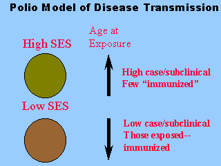 我們推測,較早期的暴露接觸的結果,因這種暴露接觸會產生無症狀的感染,會使暴露者產生免疫?以對抗何杰金氏病。反過來,較晚期的暴露接觸則較可能產生明顯的症狀。低 SES 區域因為衛生情況較不良的緣故,被認為會發生較早期的感染。