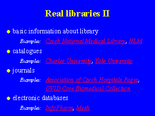 現今已經可以藉由網際網路從真實的圖書館獲得許多資訊。首先看一看我舉出的捷克與美國兩個例子,然後試試看在您的國家中是否可以找到類似的資源(例如利用 AltaVista 搜尋引擎)。