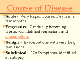 The course of the disease is in many ways the classic type of Human Leukocyte Antigen (HLA) diseases, with a varied course, some moving quickly to death, whereas to others, the disease is not found until autopsy. |
