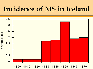 There were clear epidemics of MS in the North Atlantic. This has been attributed to the British and their military bases spreading some agent that causes MS. |